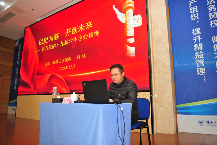 為深入學(xué)習(xí)宣傳貫徹黨的十九屆六中全會(huì)精神,12月29日下午,公司特邀江陰市委宣講團(tuán)成員、園區(qū)黨委委員、紀(jì)委書記劉銘來(lái)司進(jìn)行黨的十九屆六中全會(huì)精神宣講。
